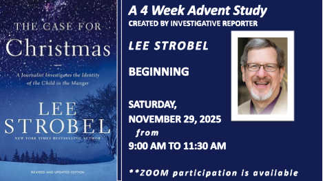 In The Case for Christmas Bible Study, led by New York Times bestselling author Lee Strobel and a former atheist, participants will dig into the true Christmas story to sort out the fact from the fiction and the hype from the holiness. This Bible study will help them reflect on the gospel story of the birth of Jesus in a focused and group-oriented way that will change the way that they view the season. Come study with us and enjoy the spirit of he Christmas Season.